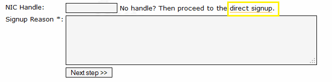 3. Se você não tem um “NIC Handle” (geralmente usuários comuns não tem), clique em “direct signup”(veja na figura abaixo):